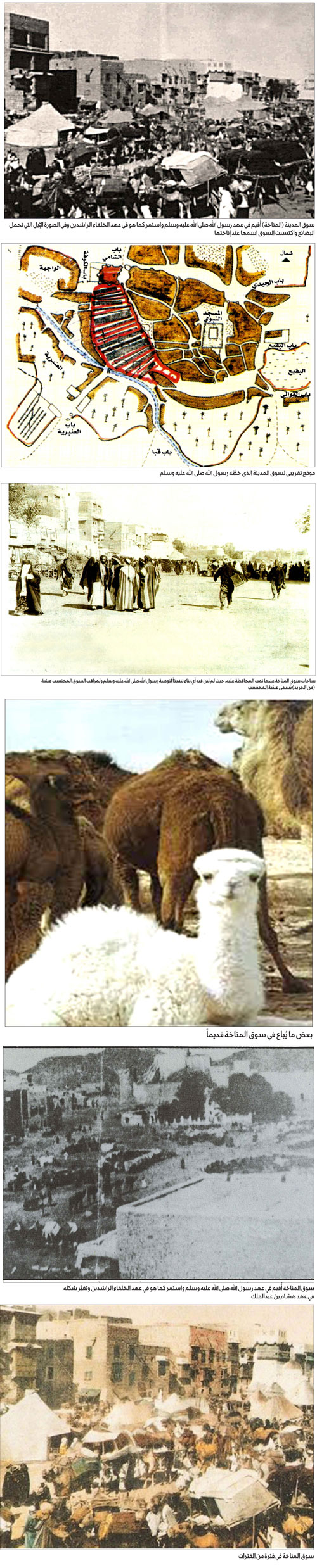 سوق المدينة (المناخة) أحد الأماكن ذات العبق التاريخي المرتبطة بالعهد النبوي، يقع غربي المسجد النبوي ويبدأ شمال مسجد المصلى، وعرف بالمصلى لأن في موضعه كان النبي صلى الله عليه وسلم يصلي صلاتي العيد والاستسقاء. تاريخ المدينة لابن شبه (1/ 135) والسمهودي في وفاء الوفا (3/ 26) ويمتد إلى القرب من ثنيّات الوداع شمال المدينة المنورة قديماً، أي: يحدّ سوق المدينة من الجنوب مسجد المصلى ويمتد حتى شرق جبل سُلَيْع (باب الكومة) وقد اشتهرت المناخة كذلك بأن جزءاً منها وهو الجزء الشمالي الأقرب إلى ثنية الوداع كان مركزاً لمسابقة الخيول، وكان الرسول صلى الله عليه وسلم يحضر أحياناً، وقد بني في موقع السباق مسجد يسمى مسجد السبق (قد أزيل حديثاً)، فعن عبد الله بن عمر أن رسول الله صلى الله عليه وسلم سابق بين الخيل التي قد أضمرت من الحفياء (في الشمال الغربي لجبل أحد)، وكان أمدها (نهاية السباق) ثنية الوداع، وسابق بين الخيل التي لم تضمر من الثنية إلى مسجد بني زريق (أي: مسجد السبق) وأن عبد الله بن عمر كان ممن سابق بها. رواه البخاري، وقد اختار رسول الله صلى الله عليه وسلم سوق المناخة للمسلمين ما بين المسجد الذي سُمي لاحقاً بمسجد السبق ومسجد المصلى، وذلك بعد هجرة رسول الله صلى الله عليه وسلم إلى المدينة؛ ليخلصهم من سيطرة اليهود على الاقتصاد في المدينة المنورة، وبقي هذا السوق صامداً - كموقع- حتى وقت قريب ويعرف أهل المدينة حدود ذلك السوق حتى وقت قريب، حيث تبتدئ حدودها الأصلية لهذا السوق من مسجد المصلى إلى قلعة الباب الشامي (والقلعة كانت على جبل سليع باب الكومة وقد أزيلت)، وأصول هذه الحدود قديمة، فقد روى ابن شبة في تاريخ المدينة المنورة (ص 304) أن رسول الله صلى الله عليه وسلم ضرب قبة في موضع بقيع الزبير فقال: هذا سوقكم، فأقبل كعب بن الأشرف فدخلها وقطع أطنابها، فقال رسول الله صلى الله عليه وسلم: «لا جرم لأنقلنها إلى موضع هو أغيظ له من هذا»؛ فنقلها إلى موضع سوق المدينة ثم قال: «هذا سوقكم لا تتحجروا ولا يضرب عليه الخراج». وفي رواية أن رجلاً جاء إلى النبي صلى الله عليه وسلم فقال: يا رسول الله إني قد رأيت موضعاً للسوق أفلا تنظر إليه؟ فجاء به إلى موضع سوق المدينة، قال: فضرب النبي صلى الله عليه وسلم برجله، وقال: «هذا سوقكم فلا ينقص منه ولا يضربن عليه خراج. رواه ابن ماجة». ولم تذكر المصادر حدوداً معينة للسوقأو مساحة محددة بالضبط، كما أنه لا توجد مبان بهذا السوق وإنما هو فضاء يحضر التجار إليها صباحاً، ومن سبق إلى موقع وضع بضاعته فيه ويتاجر إلى نهاية اليوم، حيث يحمل متاعه ليعود في اليوم الثاني، كما لا توجد له أبعاد من حيث الطول أو العرض في أول إنشائه غير أنه محدود عند إنشائه بمواقع فقد ورد عن عبد الله بن محمد قال: «كان الراكب ينزل سوق المدينة فيضع رحله، ثم يطوف بالسوق ورحله بعينه يبصره لا يغيبه عنه شيء» وفاء الوفا للسمهودي (2/ 688).. ويظهر من هذا بأن مساحة السوق كانت متوسطة بحيث يرى الزائر ركبه. ثم انطلق هذا السوق مع دور السكن في العصر الأموي في عهد هشام بن عبد الملك، وظهرت الشوارع التجارية لتسهيل حركة الأفراد وحركة البضائع، كما نظمت فيه الدكاكين ليكون سوقاً ثابتاً. وقد ذهب أحد الباحثين إلى تحديد سوق المدينة في عهد رسول الله صلى الله عليه وسلم قائلاً: «يحده شمالاً ثنية الوداع الشامية وقد بنت عليها الحكومة مسجداً يعرف بمسجد الثنية، ويحده جنوباً مسجد المصلى (الغمامة) الذي أسسه عمر بن عبد العزيز - رحمه الله- ثم بناه العثمانيون وتم تجديده في العهد السعودي، ويحده شرقاً مشهد مالك بن سنان -رضي الله عنه - وقد أدخل في الحرم وعلى بعد خمسين متراً تقريباً إلى الشرق من سور الحرم الغربي الجديد، وأشار في الهامش إلى أن المسافة بين حدي السوق الشمالي والجنوبي تساوي تقريباً ألفاً ومائتين وخمسين متراً. وقد سُميت سوق المناخة بأسماء متعددة منها: سوق المدينة، بقيع الخيل، سوق المصلى، سوق البقيع، سوق البطحاء، سوق الزوراء. موسوعة مكة المكرمة والمدينة ال