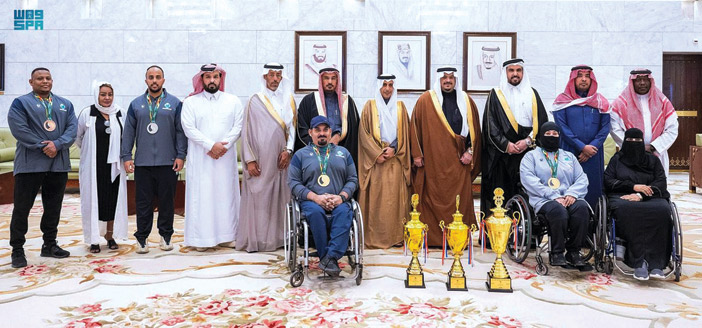 استقبل صاحب السمو الملكي الأمير فيصل بن بندر بن عبدالعزيز أمير منطقة الرياض، في مكتبه بقصر الحكم أمس مديرفرع وزارة الرياضة بالمنطقة المكلف يحيى القرني ورئيس مجلس إدارة نادي ذوي الإعاقة بالمنطقة فهد الفقير وأعضاء مجلس الإدارة، واستمع سموه إلى شرح عن منجزات نادي ذوي الإعاقة بمنطقة الرياض وتاريخ تأسيس النادي والبطولات التي حققها ومسيرته الرياضية على المستويات المحلية والخارجية. ثم التقط سمو أمير منطقة الرياض الصور التذكارية مع منسوبي النادي والميداليات والكؤوس الحاصلين عليها. كما استقبل صاحب السمو الملكي الأمير محمد بن عبدالرحمن بن عبدالعزيز، نائب أمير منطقة الرياض في مكتبه بقصر الحكم أمس مدير فرع وزارة الرياضة بالمنطقة المكلف يحيى القرني ورئيس مجلس إدارة نادي ذوي الإعاقة بالمنطقة فهد الفقير وأعضاء مجلس الإدارة. واستمع سموه إلى شرح عن النادي والإنجازات التي حققها ومسيرة تأسيسه والبطولات الرياضية التي حققها على المستويات المحلية والخارجية. ثم التقط سموه الصور التذكارية مع منسوبي النادي والميداليات والكؤوس الحاصلين عليها.