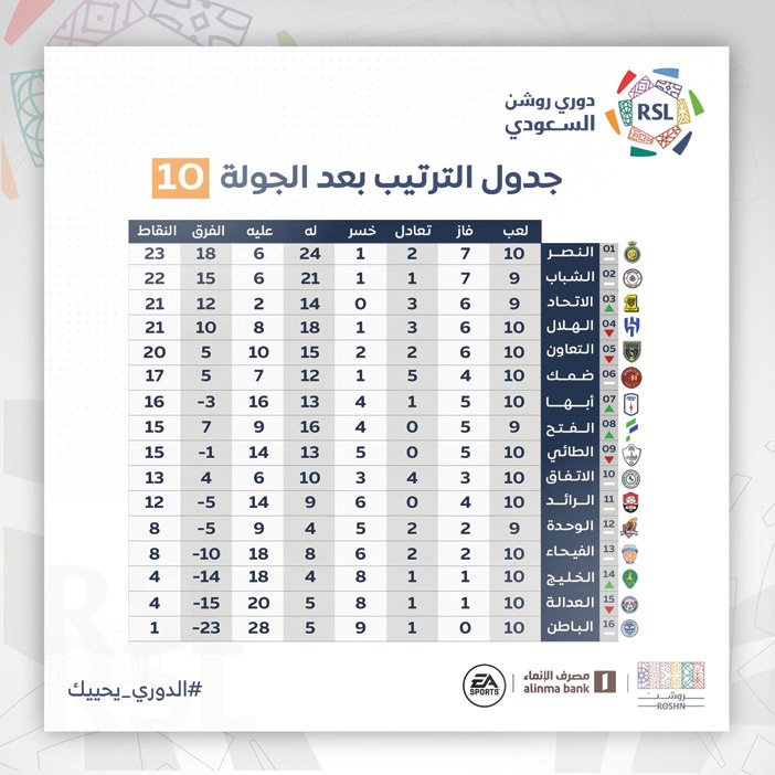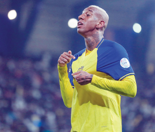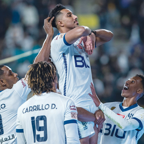 تعادل النصر والهلال 2-2 أمس في قمة الجولة العاشرة من دوري روشن السعودي للمحترفين بعد ديربي على ملعب مرسول بارك أوفى بكامل وعوده حيث حضرت الإثارة والأداء والانضباط الفني وعبقرية الأفراد. وبهذه النتيجة حافظ النصر على الصدارة برصيد 23 نقطة مبتعدا بنقطة عن الشباب ونقطتين عن الاتحاد والهلال، والأخير تراجع للمركز الرابع. هاجم النصر باحثا عن هدف مبكر لكن البداية كانت لصالح الهلال حين منح النيجيري إيغالو الأخير هدف التقدم بعد 10 دقائق، ليبدأ العالمي رحلة البحث عن هدف التعادل وعاد الزعيم لمواقعه معتمدا على المرتدات التي يقودها كاريلو. وكان النصر قريبا من تعديل النتيجة قي فرصتين أخطرها رأسية أبوبكر فينسنت التي ارتدت من القائم الأيمن للمعيوف في الدقيقة 33. وخسر الهلال خدمات محمد البريك خلال الشوط الأول حيث غادر مصابا تاركا مركزه لناصر الدوسري.