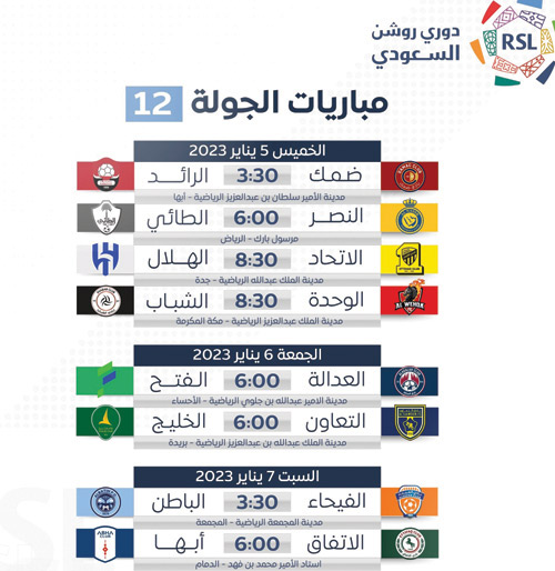 تنطلق مساء اليوم الخميس مباريات الجولة الثانية عشرة من مسابقة دوري روشن السعودي عندما تلعب أربع مباريات ستشهد اللقاء الأقوى والكلاسيكو الأكثر إثارة الذي سيجمع الاتحاد بالهلال في جدة بينما سيلاقي ضمك نظيره الرائد في أبها ويستضيف النصر ضيفه الطائي في الرياض فيما يواجه الوحدة نظيره الشباب في مكة المكرمة.