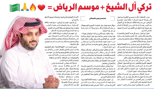 شكرًا لك معالي المستشار تركي آل الشيخ ولكافة فريق عملك ومستشاريك، وكل شخص عمل وأسهم في نجاح «أبو المواسم»، فقد «فاق جهدكم كل خيال»، وباتت سمعتكم «عطرًا» في كل مكان، وأصبحت الرياض خيارًا واختيارًا لكل من أراد الاستمتاع.