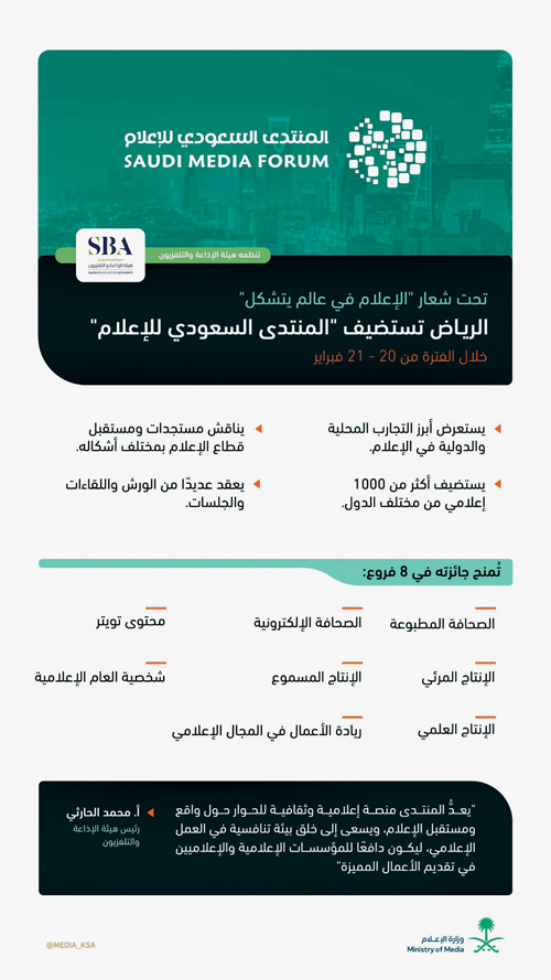 ويقام هذا الحدث الإعلامي الكبير، الذي تنظمه هيئة الإذاعة والتلفزيون، تزامناً مع الزخم الكبير الذي تعيشه المملكة والعاصمة الرياض تحديداً مع احتفالات المملكة بذكرى يوم التأسيس هذا العام في الثاني والعشرين من فبراير، إضافة إلى الإعلان عن جائزة المنتدى وشخصية العام الإعلامية، في دلالة واضحة على الدور الكبير الذي باتت تلعبه الرياض في التأثير على المشهد الإعلامي إقليميا ودوليا، بمشاركة أكثر من 1000 إعلامي من مختلف الدول، إضافة إلى نخبة من قادة وخبراء الإعلام في العالم، في حدث عالمي يسلط الضوء على موضوعات الإعلام المعاصر في ظل المتغيرات التي يشهدها العالم، وذلك للإسهام في مواجهة التحديات وطرح الحلول التي بدورها تؤثر على مستقبل الإعلام.