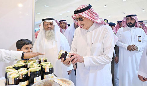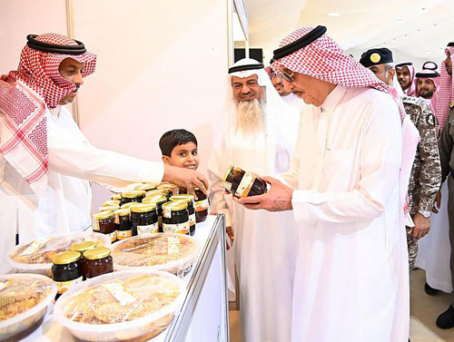دشَّن صاحبُ السموِّ الملكي الأمير محمد بن ناصر بن عبدالعزيز، أمير منطقة جازان، بحضور صاحبِ السموِّ الملكي الأمير محمد بن عبدالعزيز بن محمد بن عبدالعزيز، نائب أمير المنطقة، فعاليات مهرجان «عسل جازان» الثامن، الذي ينظمه فرع وزارة البيئة والمياه والزارعة بمنطقة جازان، وذلك بساحة المركز الحضاري في المحافظة. وقصَّ سموُّه الشريطَ إيذانًا بانطلاق المهرجان، الذي يسعى للتعريف بما تزخر به محافظة العيدابي خاصة ومنطقة جازان بوجه عام من مقومات زراعية وسياحية واقتصادية واستثمارية في شتَّى المجالات؛ منها إنتاج العسل، ودعم النحالين.، مطلعاً على أركان معرض النحالين المقام بخيمة العسل. واستمع سموُّ أميرِ المنطقة -خلال الجولة- لشرح مفصَّل من مدير عام فرع البيئة والزراعة والمياه بجازان المهندس محمد بن علي آل عطيف، عن المعرض الذي يتضمَّن مشاركة 55 نحَّالًا، يعرضون أكثر من 10 أطنان من مختلف أنواع العسل عالي الجودة، الذي تشتهر منطقة جازان بإنتاجه، إلى جانب معرض الإدارات الحكومية المشاركة ومعرض «فنون وتراث بلغازي» المصاحب للمهرجان، وركن الأسر المنتجة الذي تشارك فيه 100 أسرة بدعم من بنك التنمية الاجتماعية؛ وركن هيئة تطوير المناطق الجبلية.