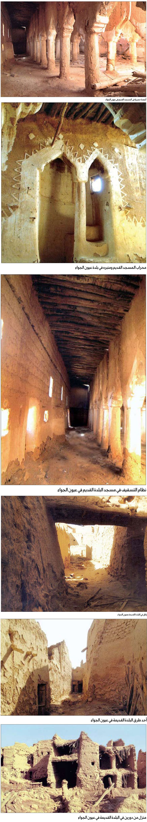 ويوجد في عيون الجواء وما حولها عدد من المواقع الأثرية والمعالم التاريخية.. يأتي في مقدمتها الرسوم الصخرية في جبل أثال، وجبلي الحنادر وهي عبارة عن صور لحيوانات وطيور مثل الزرافات والوعول والأبقار والخيول، ومناظر صيد ومعارك يبدو فيها محاربون وأسلحة مثل القوس والرمح، وتتشابه الرسوم الصخرية في عيون الجواء مع مثيلاتها في جبل ياطب بحائل، والصويدرة (الطرف) بالمدينة المنورة، وإلى جانب الرسوم الصخرية هناك الكثير من النقوش الكتابية والمخربشات بخط البادية (الثمودي). ومن آثار عيون الجواء أيضاً الآبار القديمة التي تتقارب وترتبط مع بعضها عن طريق خنادق وسراديب. ومن أمثلتها بئر الهلالية في القوارة وآبار ضارج (ضاري) ومن العيون القديمة في عيون الجواء عين عبس، وعين الثومة، ومن الآثار الأخرى قلعة العنتريات في قصيباء .. وهي تنسب إلى عنترة بن شداد، والقلعة عبارة عن بقايا قصر مستطيل الشكل له أبراج وشيد القصر من الأحجار، أما قصر الحويطي فيقع في القرعاء وشيد من الحجارة واللبن ( الطين ) المخلوط بالتبن، وتوجد في عيون الجواء أبراج عدة كانت تستخدم للمراقبة والدفاع عن المنطقة ضد أي عدوان.