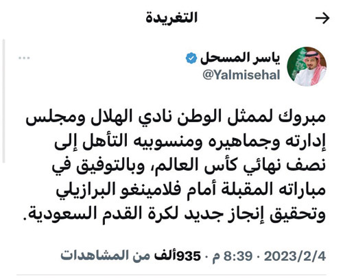 كما قدَّم رئيس الاتحاد السعودي لكرة القدم ياسر المسحل للهلال إدارةً وجماهيرَ ومنسوبين ولاعبين التهاني بتأهل الفريق الكروي الأول ممثِّل الوطن إلى نصف نهائي المونديال العالمي، وتمنى في تغريدة مماثلة للهلال التوفيق في مباراته المقبلة أمام فلامينغو البرازيلي وتحقيق منجز جديد لكرة القدم السعودية.