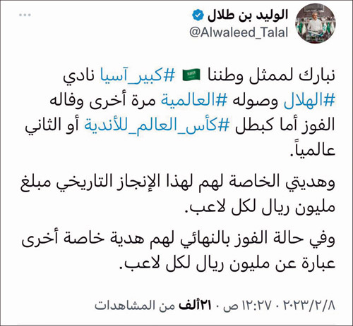 من جهته بارك عضو شرف نادي الهلال وداعمه الكبير الأمير الوليد بن طلال لممثل الوطن وصوله للنهائي الكبير، وأعلن في تغريدة عبر حسابه الشخصي في تويتر عن تقديمه هدية خاصة لكل لاعب مبلغ مليون ريال.