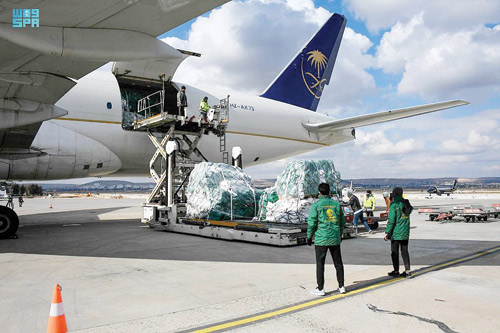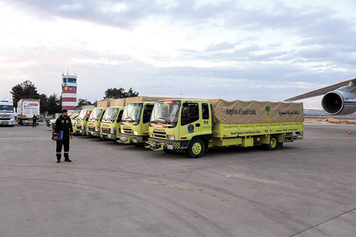 إنفاذاً لتوجيهات خادمِ الحرمين الشريفين الملك سلمان بن عبدالعزيز آل سعود، وصاحب السمو الملكي الأمير محمد بن سلمان بن عبدالعزيز آل سعود ولي العهد رئيس مجلس الوزراء -حفظهما الله- أطلقت المملكة جسراً جوياً من مطار الملك خالد الدولي بطائرات الإغاثة السعودية، التي تحمل على متنها عديد من مئات الأطنان من المواد الإغاثية والإيوائية شملت أطناناً من المواد الغذائية والخيام والبطانيات والبسط والحقائب الإيوائية، إضافة إلى الفرق الصحية والمواد الطبية وفرق البحث والإنقاذ السعودي مع جميع التجهيزات التي يحتاجها من الآليات والمعدات والمضخات والأدوية الطبية والتجهيزات الفنية وغيرها.