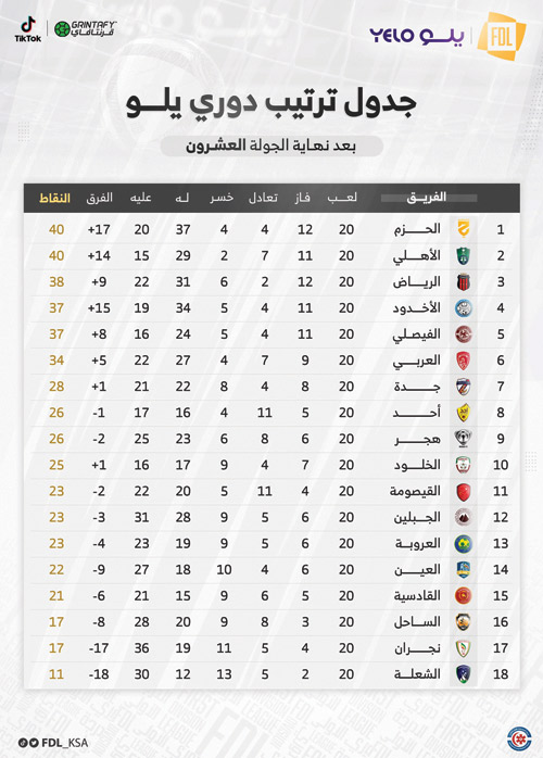 تصدر فريق الحزم ترتيب فرق دوري يلو لأندية الدرجة الأولى برصيد 40 بعد أن حقق فوزاً مهماً على نجران بثلاثية نظيفة، في اللقاء الذي جمع الفريقين على استاد الأمير هذلول بن عبدالعزيز في نجران ضمن مباريات الجولة 20 من الدوري. سجل أهداف الحزم جويل تاجو هدفين وفرحان العازمي، وبعد خسارته الثقيلة بقي نجران على رصيده 17 نقطة في المركز قبل الأخير.