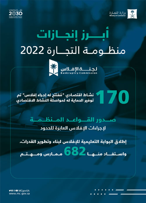 وأسهمت لجنة الإفلاس في توفير الحماية لـ170 نشاطاً اقتصادياً مفتتحا له إجراء إفلاس لمواصلة النشاط الاقتصادي، كما أصدرت اللجنة القواعد المنظمة لإجراءات الإفلاس العابرة للحدود وأطلقت البوابة التدريبية للإفلاس لبناء وتطوير القدرات استفاد منها 682 ممارساً ومهتماً.