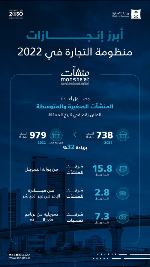 وعلى صعيد المنشآت الصغيرة والمتوسطة، بلغ إجمالي المنشآت حتى نهاية الربع الثالث 2022م (979 ألف منشأة) بزيادة 32 في المائة عن العام 2021م، كما واصلت الهيئة العامة للمنشآت الصغيرة والمتوسطة تمكين رواد ورائدات الأعمال بصرف أكثر من 15.8 مليار ريال عبر بوابة التمويل، وأكثر من 2.8 مليار ريال من مبادرة الإقراض غير المباشر، وصرف 7.3 مليار ريال من برنامج تمويل المنشآت الصغيرة والمتوسطة «كفالة».