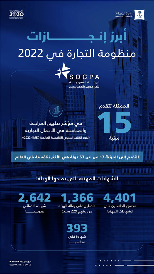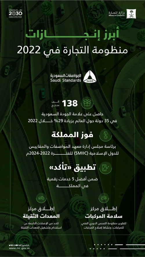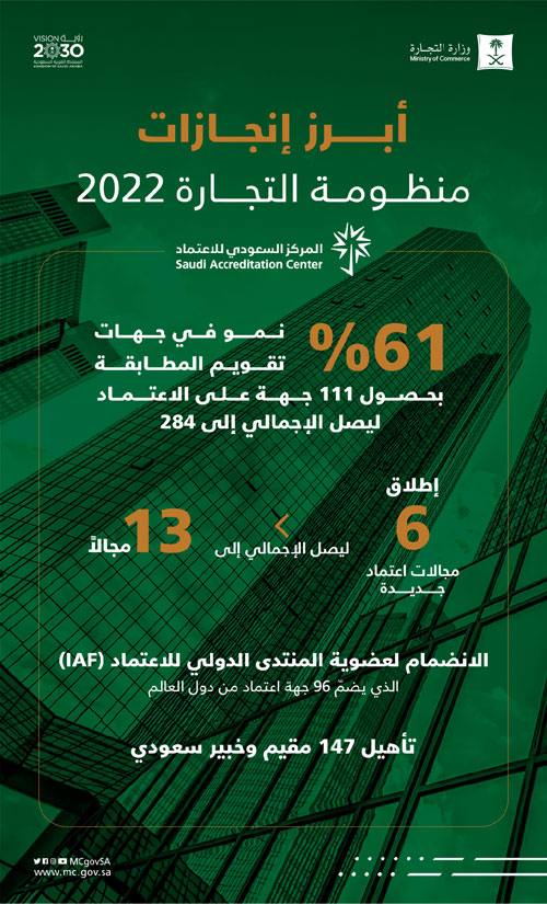 وفي إطار تعزيز سلامة المنتجات الوطنية، منحت الهيئة السعودية للمواصفات والمقاييس والجودة 138 ألف منتج علامة الجودة السعودية في 35 دولة حول العالم بزيادة 29 في المائة على العام 2021. وأسهمت جهود الهيئة السعودية للمراجعين والمحاسبين في تقدم المملكة 15 مرتبة في «مؤشر تطبيق المراجعة والمحاسبة في الأعمال التجارية» في تقرير الكتاب السنوي للتنافسية العالمية IMD 2022 لتصل إلى المرتبة 17 من بين أكبر 63 دولة تنافسية عالمياً.