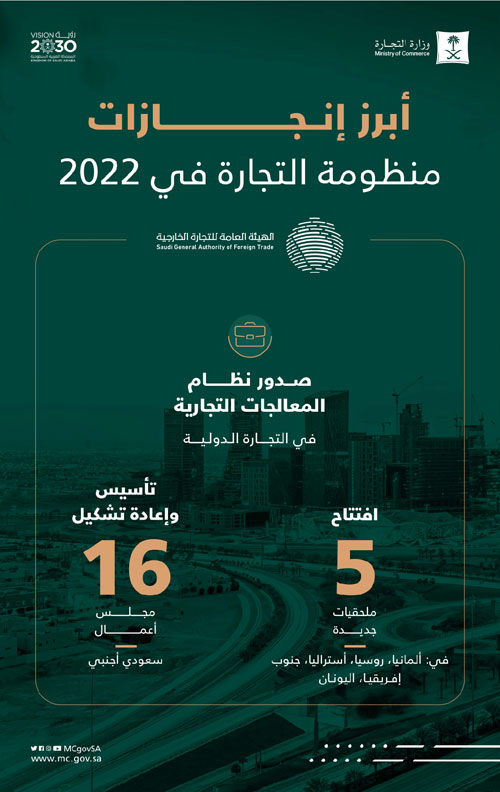 وصدر خلال العام 2022م نظام المعالجات التجارية في التجارة الدولية، وافتتحت الهيئة العامة التجارة الخارجية 5 ملحقيات تجارية جديدة في: ألمانيا وروسيا وأستراليا وجنوب أفريقيا واليونان، وتم تأسيس وإعادة تشكيل 16 مجلس أعمال سعودي وأجنبي لتعزيز التجارة البينية واستغلال فرص استثمار القطاع الخاص.