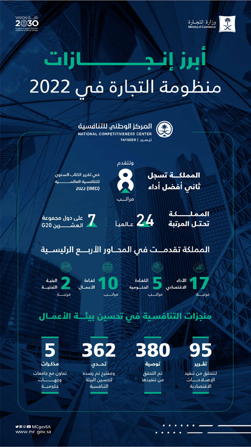 واصلت المملكة العربية السعودية تقدمها خلال العام 2022م في المؤشرات العالمية، حيث تقدمت ثماني مراتب بين الدول الأكثر تنافسية في العالم، محققةً ثاني أفضل أداء في تقرير الكتاب السنوي للتنافسية العالمية (IMD 2022)، متقدمةً في جميع المحاور الرئيسية، واحتلت المركز 24 عالمياً من بين 63 دولة، والسابع على مستوى دول مجموعة العشرين.
