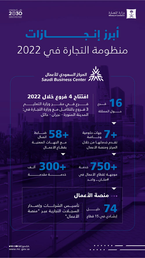 واهتمت وزارة التجارة في العام 2022م بتحفيز البيئة التجارية وتعزيز التشريعات بإصدار نظام الشركات الجديد لتحفيز المنظومة التجارية وتنميتها، كاشفة عن زيادة الشركات المتحولة إلى «مساهمة مقفلة» بنسبة 27 في المائة، حيث تم تمكين 208 شركات من التحول، وصدر خلال العام 314.949 سجلاً تجارياً للشركات والمؤسسات بزيادة 6 في المائة على 2021م.