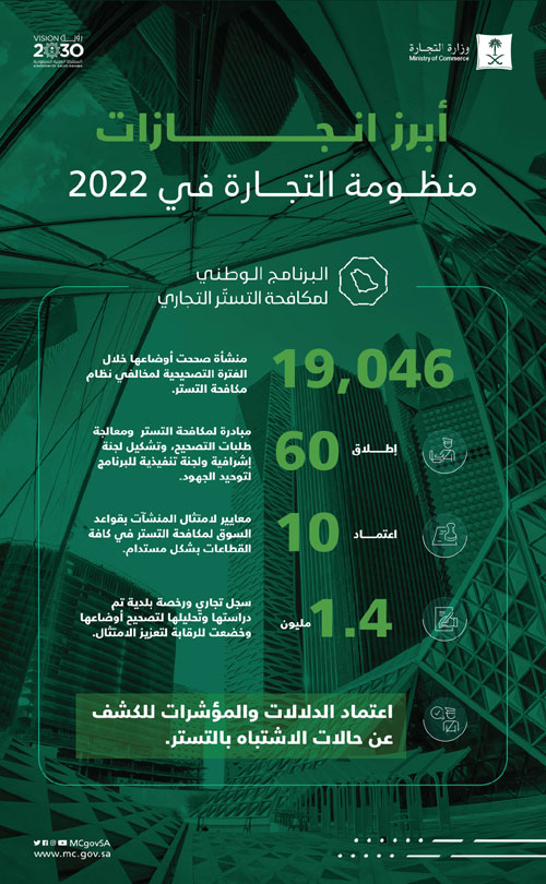 وأثمرت الفترة التصحيحية لمخالفي نظام مكافحة التستر عن تصحيح أوضاع 19.046 منشأة، كما تم دراسة وتحليل 1.4 مليون سجل تجاري ورخصة بلدية لتصحيح أوضاعها وخضعت للرقابة لتعزيز الامتثال، وأطلق البرنامج الوطني لمكافحة التستر التجاري 60 مبادرة لمكافحة التستر ومعالجة طلبات التصحيح، واعتمد 10 معايير لامتثال المنشآت بقواعد السوق لمكافحة التستر في جميع القطاعات بشكل مستدام.