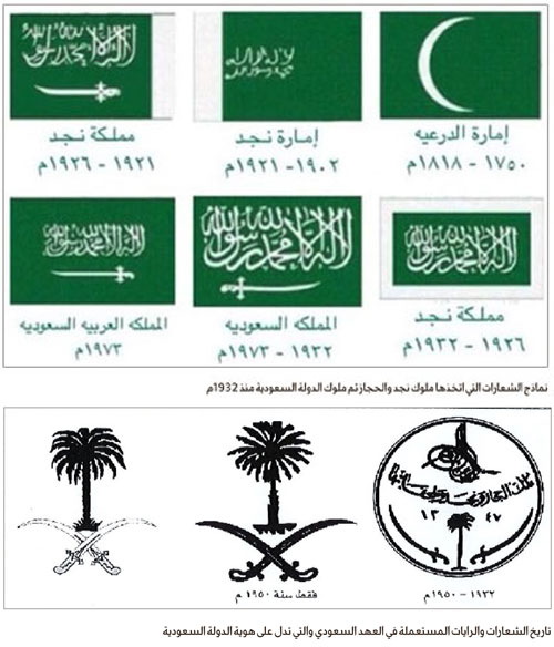 العلم السعودي يرمز إلى أصالة متوارثة ضاربة في عمق التاريخ السعودي المجيد، ومنذ قيام الدولة السعودية الأولى رفعت أول راية سنة 1157هـ، وحتى قيام المملكة العربية السعودية بقيادة الملك المؤسس وكانت الراية السعودية خضراء اللون كتب عليها (لا إله إلا الله محمد رسول الله)، وأُضِيف لها في عهد الملك عبدالعزيز سيف تحت الشهادتين، ثم صدر في 12 محرم 1357هـ نظام العَلَم السعودي، وفي 10 صفر 1393هـ أصدر الملك فيصل نظام العَلَم السعودي، واستُحدِث عَلَم الملك الخاص، وهو العلم الوطني مضافًا إليه شعار المملكة باللون الذهبي في الركن الأيمن، أسفل العلم.