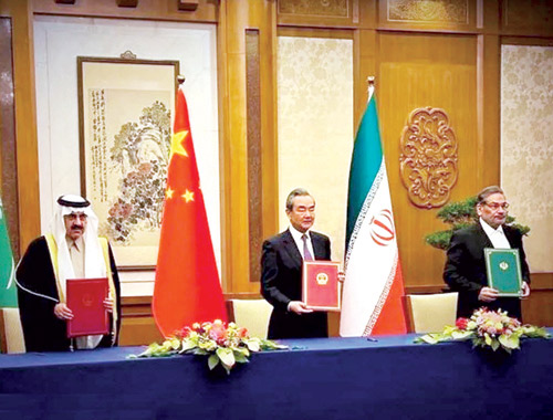 من جهته، قال كبير الدبلوماسيين الصينيين وانغ يي، إن استئناف العلاقات الدبلوماسية بين الرياض وطهران «نصر» للحوار والسلام.