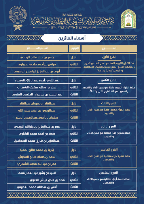 تحت رعاية خادم الحرمين الشريفين الملك سلمان بن عبدالعزيز - حفظه الله - رعى صاحب السمو الملكي الأمير فيصل بن بندر بن عبدالعزيز مساء أمس الخميس الحفل الختامي لمسابقة جائزة خادم الحرمين الشريفين الملكِ سلمان بنِ عبدالعزيز آل سعود،لحفظ القرآن الكريم وتلاوته وتفسيره للبنين والبنات في دورتها الرابعة والعشرين، التي عُقدت تصفياتها النهائية مؤخرًا في مدينة الرياض، بمشاركة 105 متسابقين ومتسابقات تنافسوا على فروع المسابقة الستة، وبجوائز إجمالية بلغت أكثر من 3.000.000 ريال. وأشاد معالي وزير الشؤون الإسلامية والدعوة والإرشاد الشيخ الدكتور عبداللطيف بن عبدالعزيز آل الشيخ، بمستوى الأبناء المشاركين في الجائزة، وتمكُّن حفظ القرآن الكريم في صدورهم، وتميُّزهم في حُسن التلاوة والأداء والتفسير، منوِّهاً بما حققوه من إنجاز عظيم، وتفوق مستحق بإتقانهم حفظ كلام الله تعالى، ومعرفة تفسيره، مقدمًا التهنئة للفائزين ووالديهم بهذا التفوق والإنجاز، موصيًا إياهم بالعمل على هذا الكتاب العظيم، والدعاء لخادمِ الحرمين الشريفين الذي يرعى هذه المسابقة المحلية،وسموِّ وليِّ عهده الأمين - حفظهما الله - سائلا اللهَ أن يجزيَهم خيرَ الجزاء على عنايتهم بالقرآن الكريم وأهله.