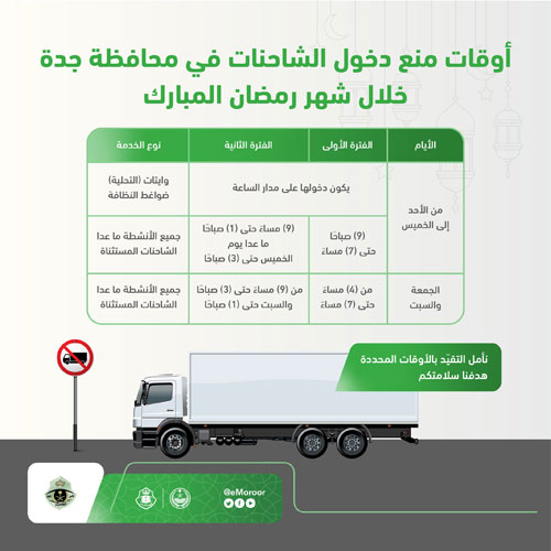 أعلنت الإدارة العامة للمرور أوقات منع دخول الشاحنات في مدن الرياض والدمام والظهران ومحافظة الخبر ومحافظة جدة خلال شهر رمضان المبارك، داعية إلى التقيد بالأوقات المحددة لسلامة الجميع. وأضافت أنه يمنع دخول الشاحنات في مدينة الرياض خلال شهر رمضان المبارك من الأحد حتى الخميس من الـ (8) صباحًا حتى الـ (2) صباحًا، والخدمات من الـ (8) صباحًا حتى الـ (12) ظهرًا ومن الـ (3) مساءً حتى الـ (6) مساءً، وفي عطلة نهاية الأسبوع يمنع دخول الشاحنات من الـ (4) مساءً حتى الـ (8) صباحًا، والخدمات من الـ (4) مساءً حتى الـ (6) مساءً ومن الـ (9) مساءً حتى الـ (1) صباحًا، فيما يمنع دخولها على امتداد طريق مكة (خريص) ما بين مخرج 13 حتى السفارات شرقًا وغربًا، وطريق الملك فهد من مخرج 4 حتى ميدان الجزائر (ديراب) شمالًا وجنوبًا. وأشارت إلى أنه يمنع دخول الشاحنات في محافظة جدة من الأحد حتى الخميس من الـ (9) صباحًا حتى الـ (7) مساءً ومن الـ (9) مساءً حتى الـ (1) صباحًا عدا الخميس حتى الـ (3) صباحًا، وفي أيام العطل يمنع دخولها من الـ (4) مساءً حتى الـ (7) مساءً ومن الـ (9) مساءً حتى الـ (3) صباحًا عدا السبت حتى الـ (1) صباحًا، ويستثنى من المنع وايتات المياه (التحلية) وضواغط النظافة.