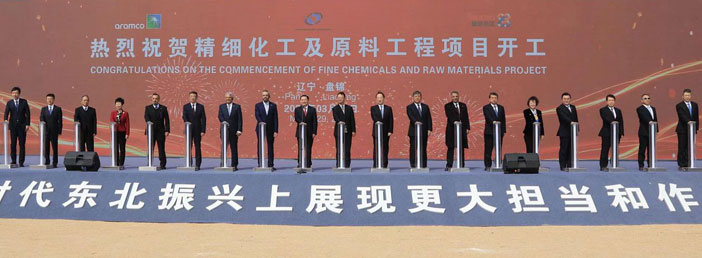 جرت أمس مراسم وضع حجر الأساس لمصفاة متكاملة ضخمة ومجمع بتروكيميائيات في شمال شرق الصين، حيث تبدأ شركة «أرامكو هواجين للبتروكيميائيات» في بنائهما.