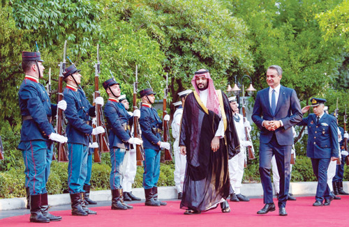 أما في اليونان فقد التقى صاحب السمو الملكي الأمير محمد بن سلمان بن عبدالعزيز دولة السيد كيرياكوس ميتسوتاكيس رئيس وزراء اليونان وذلك في قصر مكسيموس مقر رئاسة الوزراء في العاصمة اليونانية أثينا. وقد أقيمت لسمو ولي العهد مراسم استقبال رسمية. وعقد سمو ولي العهد ودولة رئيس وزراء اليونان اجتماعاً ثنائياً رحب في بدايته دولة السيد كيرياكوس ميتسوتاكيس بسمو الأمير محمد بن سلمان بن عبدالعزيز في زيارته الحالية لليونان متمنياً له ومرافقيه طيب الإقامة، فيما عبر سمو ولي العهد عن سعادته بهذه الزيارة مقدراً الحفاوة وحسن الاستقبال. وعقد سمو ولي العهد ودولة رئيس وزراء اليونان اجتماعاً موسعاً بحضور وفدي البلدين. وجرى خلال الاجتماع الموسع استعراض أوجه العلاقات الثنائية بين البلدين، والفرص الواعدة في مختلف المجالات وسبل تطويرها بما يخدم المصالح المشتركة للبلدين والشعبين الصديقين. كما جرى بحث عدد من الموضوعات ذات الاهتمام المشترك ومستجدات الأحداث في المنطقة.