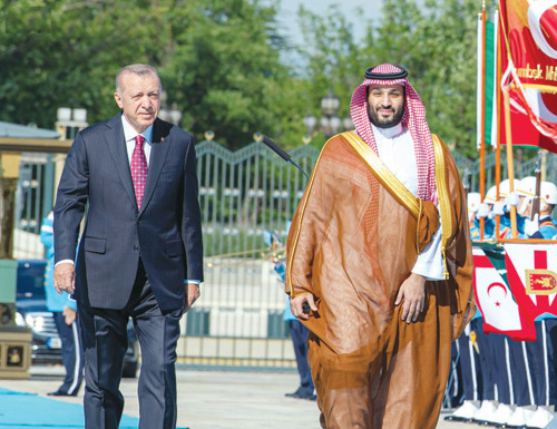 وفي تركيا التقى صاحب السمو الملكي الأمير محمد بن سلمان بن عبدالعزيز آل سعود ولي العهد رئيس مجلس الوزراء، في العاصمة التركية أنقرة الرئيس رجب طيب أردوغان رئيس جمهورية تركيا. وفور وصول سمو ولي العهد إلى المجمع الرئاسي أقيمت لسموه مراسم استقبال رسمية. عقب ذلك عقد سمو ولي العهد وفخامة الرئيس التركي لقاءً ثنائياً رحب في بدايته الرئيس التركي بسمو ولي العهد في بلده الثاني، فيما عبر سموه عن الشكر والتقدير لفخامته على الحفاوة وحسن الاستقبال التي حظي بها ومرافقوه. ونقل سمو ولي العهد تحيات وتقدير خادم الحرمين الشريفين الملك سلمان بن عبدالعزيز آل سعود لفخامته، فيما حمله الرئيس التركي تحياته وتقديره لخادم الحرمين الشريفين. كما جرى استعراض العلاقات الثنائية بين البلدين الشقيقين وأوجه التعاون والسبل الكفيلة بتطويره في مختلف المجالات، بالإضافة إلى استعراض مستجدات الأحداث الإقليمية والدولية والجهود المبذولة تجاهها وعدد من الموضوعات ذات الاهتمام المشترك.