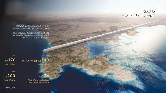منذ أن أعلن صاحب السمو الملكي الأمير محمد بن سلمان بن عبدالعزيز، ولي العهد رئيس مجلس إدارة نيوم، عن مدينة «ذا لاين»، وأعمال الإنشاءات تسير على قدم وساق لإقامة هذه المدينة الحالمة التي تعيد تعريف مفهوم التنمية الحضرية وما يجب أن تكون عليه مدن المستقبل. وتأتي تصاميم مدينة «ذا لاين»، انعكاساً لما ستكون عليه المجتمعات الحضرية مستقبلاً في بيئة خالية من الشوارع والسيارات والانبعاثات، وتسهم في المحافظة على 95 % من أراضي نيوم للطبيعة، وتعتمد على الطاقة المتجددة بنسبة 100 %، لجعل صحة الإنسان ورفاهيته أولوية مطلقة بدلاً من أولوية النقل والبنية التحتية كما في المدن التقليدية. ومن أهم مواصفات مدينة «ذا لاين»، أن عرضها يبلغ 200 متر فقط على امتداد 170 كيلو متراً ، وارتفاعٍ يبلغ 500 متر فوق سطح البحر. وستُبنى المدينة على مساحة لا تتجاوز 34 كيلو متراً مربعاً، وستتسع لنحو 9 ملايين نسمة، وهو أمر غير مسبوق تماماً في مدنٍ بهذا الحجم. وهذا بدوره، يقلل من تمدد البنية التحتية، ويعزز من كفاءة واستدامة المدينة على نحوٍ مميز. كما أن مناخها المثالي على مدار العام سيؤمن للسكان الاستمتاع بالطبيعة عند التنقل سيرا على الأقدام. وتتيح «ذا لاين» لجميع السكان إمكانية الوصول إلى جميع المرافق والخدمات في غضون 5 دقائق، إضافة إلى وجود قطار فائق السرعة يصل بين طرفي المدينة خلال 20 دقيقة.