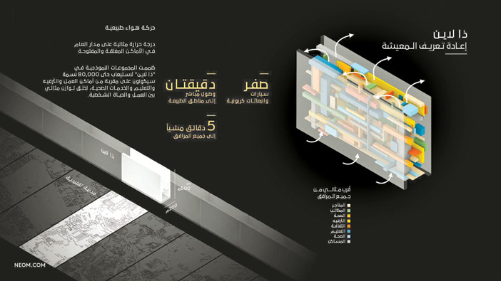 تلك المدينة التي قال عنها سمو ولي العهد رئيس مجلس إدارة نيوم: عند إطلاقنا «ذا لاين»، وعدنا بإعادة تعريف مفهوم التنمية الحضرية من خلال تطوير مجتمعات يكون الإنسان محورها الرئيسي، واليوم «ذا لاين» تحقق مثالية العيش وتعالج التحديات الملحة التي تواجه البشرية، هذه التصاميم الاستثنائية توضح الهيكل الداخلي للمدينة متعددة الطبقات وتعالج إشكاليات المدن الأفقية التقليدية المنبسطة، محققة بذلك التناغم التام بين التنمية الحضرية والحفاظ على الطبيعة بكل مواردها.