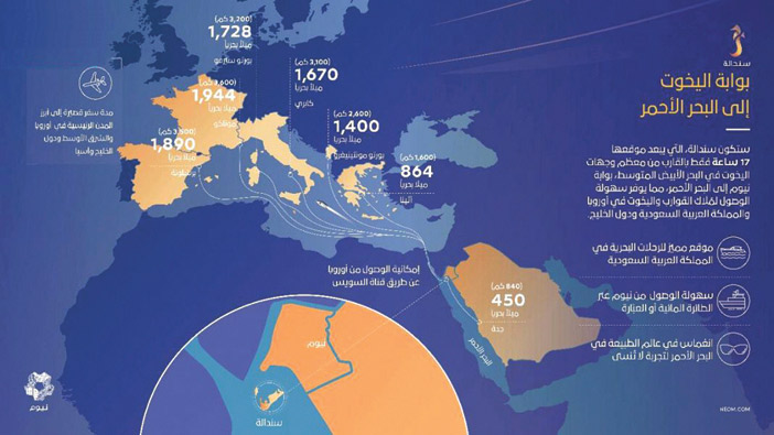 تعد جزيرة «سندالة»، أولى وجهات نيوم للسياحة البحرية الفاخرة، وأحد أهمّ المشاريع الداعمة للإستراتيجية الوطنية للسياحة، والتي تم تصميمها لتكون البوابة الرئيسة للرحلات البحرية في البحر الأحمر، ولتقديم واحدة من أهم التجارب العالمية في الضيافة والترفيه. ومن المتوقع أن تبدأ الجزيرة في استقبال الزائرين مطلع العام القادم 2024م. والتي قال عنها سمو ولي العهد رئيس مجلس الوزراء رئيس مجلس إدارة نيوم: «يمثل هذا المشروع لحظة مهمة تعكس تسارع التطوير في نيوم، ويجسد خطوة رئيسة لتحقيق طموحاتنا السياحية في إطار رؤية السعودية 2030». و»ستكون سندالة أول وجهة بحرية فاخرة ونوادي اليخوت على البحر الأحمر في نيوم، كما ستكون بوابة للسياحة العالمية في البحر الأحمر والمنطقة، تتميز بموقع فريد وطبيعة ساحرة تؤهلانها أن تكون منصة للسياحة البحرية الفاخرة على مستوى العالم».