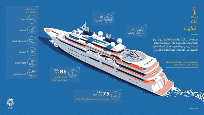 وستعمل نيوم على تحقيق هذه التطلعات بالتعاون مع العلامات التجارية العالمية في قطاعي الترفيه والفنادق لتطوير الجزيرة وجعلها وجهة حصرية وساحرة في البحر الأحمر لمجتمع اليخوت في العالم، محاطة ببيئتها البحرية الخلابة والمتنوعة التي تضم واحدة من أجمل محميات الشعاب المرجانية في العالم.