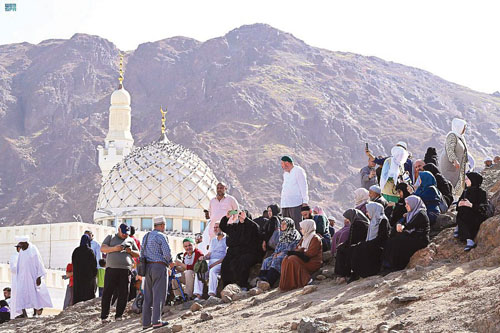 كما رصدت «عدسة «واس» مشاهد من توافد الزائرين على ساحة وميدان شهداء معركة أحد، ليستحضروا مواقفها وأحداثها خاصة عند صعودهم إلى قمة جبل الرماة الذي يتوسّط ميدان المعركة، مطلاً على جامع سيد الشهداء الذي بني في زمن لاحق واكتملت قبل أربعة أعوام كبرى مشروعات وأعمال تطوير المسجد وتوسعته، لاستيعاب 15 ألف مصلٍ، وألحقت بالمسجد مرافق وساحات خارجية، تم رصفها لاستقبال الزائرين وراحتهم.