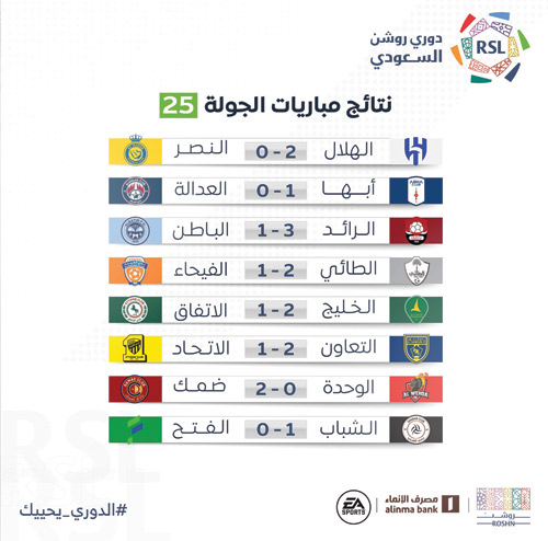 أشعل فريق التعاون المنافسة على لقب الدوري بعد أن تمكن من إلحاق الخسارة بمتصدر الدوري فريق الاتحاد بهدفين سجلهما مهاجمه فهد الرشيدي وهدف للاتحاد سجله عبدالرزاق حمدالله لتتجدد آمال النصر الذي أصبح بينه وبين المتصدر ثلاث نقاط، كما أن الشباب استعاد وهجه وحظوظه بعد أن حقق انتصاراً مهماً ومستحقاً على فريق الفتح بهدف وحيد سجله نجمه وقائده بانيغا ليرتفع رصيد الشباب لـ53 نقطة في المركز الثالث بفارق ست نقاط عن المتصدر وثلاث نقاط عن الثاني النصر. وفي مكة المكرمة تمكن ضمك من إلحاق الخسارة بالوحدة بهدفين دون رد.