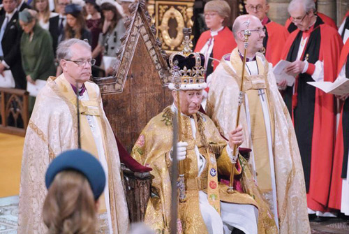 توّج تشارلز الثالث ملكاً للمملكة المتحدة في كنيسة ويستمنستر خلال مراسم دينية مهيبة أمام حوالي 2300 مدعو، بعد ثمانية أشهر على وفاة الملكة إليزابيث الثانية. ووضع رئيس أساقفة كانتربري جاستن ويلبي التاج على رأس الملك تشارلز الثالث. وقبل ذلك بوقت قصير، أقسم ...