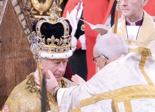 ووضع رئيس أساقفة كانتربري جاستن ويلبي التاج على رأس الملك تشارلز الثالث. وقبل ذلك بوقت قصير، أقسم الملك على خدمة رعاياه وحماية كنيسة إنجلترا التي هو رئيسها الأعلى. وسمعت هتافات «ليحفظ الله الملك» داخل الكنيسة وخارجها. وبعد ذلك توجت زوجته كاميلا ملكة.