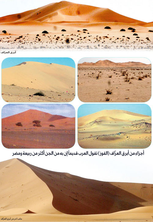 وقال أيضاً (4/ 118) عند اسم العزّاف: «وإنما سمي العزّاف؛ لأنّهم يسمعون به عزيف الجنّ وهو صوتهم، وقال السكري: العزّاف من المدينة على اثني عشر ميلاً». وقال البكري (معجم ما استعجم 3/ 940) العزّاف: بفتح أوله وتشديد ثانيه وبالفاء على لفظ فَعّال من العزف: ويقال أبرق العزّاف وأبرق الحنّان: واحد؛ لأنهم يسمعون فيه عزيف الجنّ، قال النابغة: