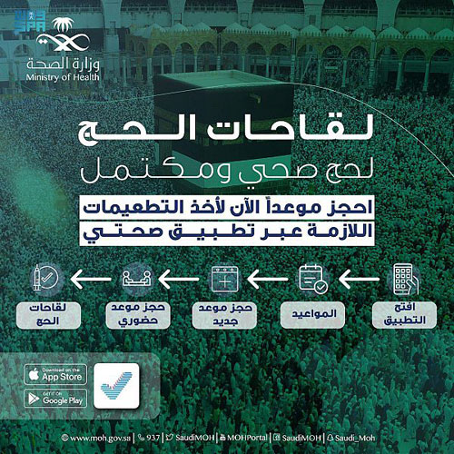 وأوضحت الصحة أنه يُمكن معرفة أسماء المستشفيات والمراكز الصحية التي تتوفر فيها تطعيمات الحج عبر تطبيق صحتي من خلال الرابط التالي: http://onelink.to/yjc3nj