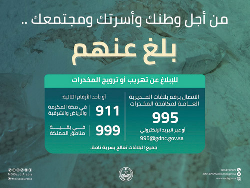 ودعت وزارة الداخلية إلى التعاون معها وذلك بالإبلاغ عن تهريب أو ترويج المخدرات، عبر الاتصال بالأرقام التالية (911) مكة المكرمة والرياض والشرقية، و(999) في بقية مناطق المملكة، ورقم بلاغات المديرية العامة لمكافحة المخدرات (995)، وعبر البريد الإلكتروني 995@gdnc.gov.sa، مشيرة إلى أنها ستعالج جميع البلاغات بسرية تامة.