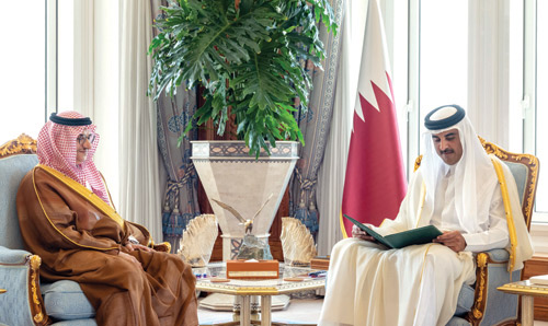 من جانبه حمل سمو أمير دولة قطر، سمو السفير، تحياته لأخيه خادم الحرمين الشريفين، وسمو ولي عهده الأمين، وتمنياته لهما بموفور الصحة والعافية، وللشعب السعودي مزيداً من الرفعة والنماء. كما جرى خلال الاستقبال، استعراض العلاقات الأخوية بين البلدين الشقيقين، وسبل تنميتها وتطويرها.