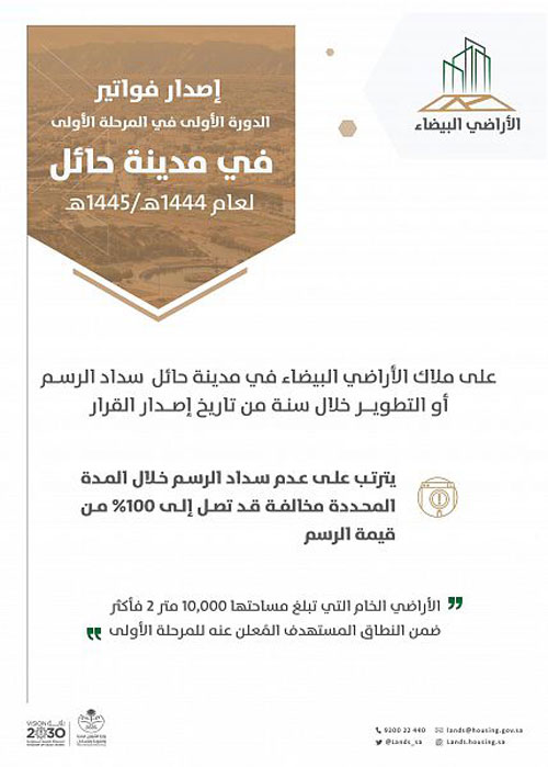 أصدر برنامج الأراضي البيضاء فواتير المرحلة الأولى من رسوم الأراضي البيضاء لعام 1444 / 1445هـ في كل من منطقة القصيم (بريدة، وعنيزة) ومدينة حائل في دورتها الأولى، داعياً ملاك الأراضي الخاضعة للرسوم إلى المبادرة بتطوير أراضيهم أو السداد خلال سنة من تاريخ إصدار القرار.