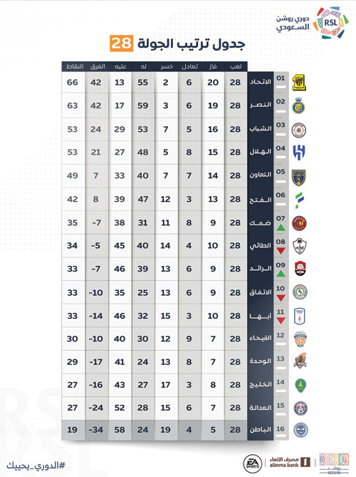 بفوزه رفع النصر رصيده إلى 63 نقطة منفردا بالوصافة،وأبقى الفارق على 3 نقاط مع المتصدر الاتحاد،كما أبقى الشباب على رصيده السابق 53 نقطة.