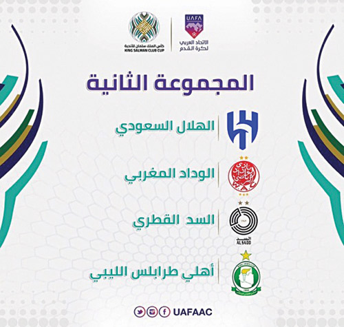 وتضم المجموعة الثانية فرق: الهلال السعودي والوداد المغربي والسد القطري.