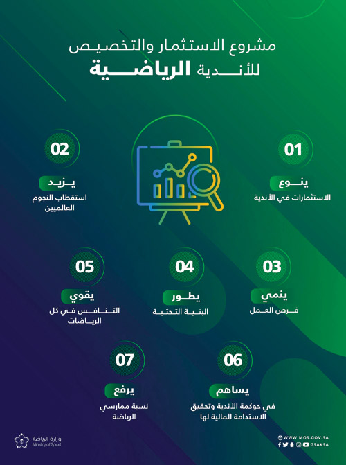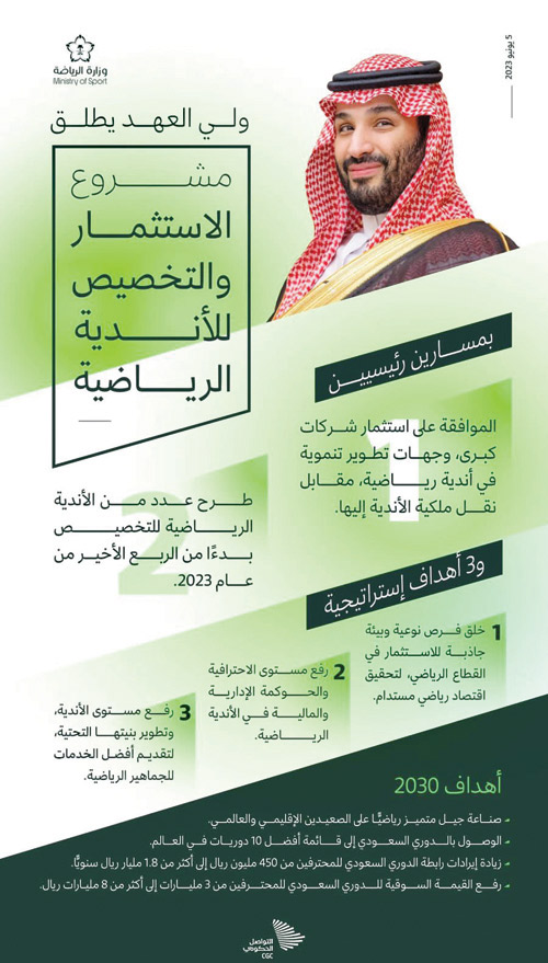 أطلق صاحب السمو الملكي الأمير محمد بن سلمان بن عبدالعزيز آل سعود ولي العهد رئيس مجلس الوزراء -حفظه الله- أمس مشروع الاستثمار والتخصيص للأندية الرياضية، بعد اكتمال الإجراءات التنفيذية للمرحلة الأولى، تحقيقًا لمستهدفات رؤية السعودية 2030 في القطاع الرياضي، الهادفة إلى بناء قطاع رياضي فعال، من خلال تحفيز القطاع الخاص وتمكينه للمساهمة في تنمية القطاع الرياضي، بما يحقق التميز المنشود للمنتخبات الوطنية والأندية الرياضية والممارسين على الأصعدة كافة.