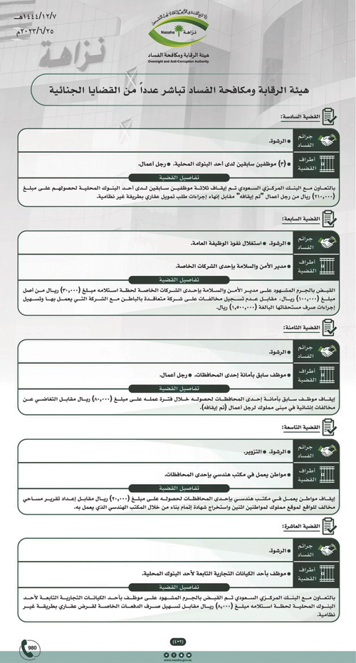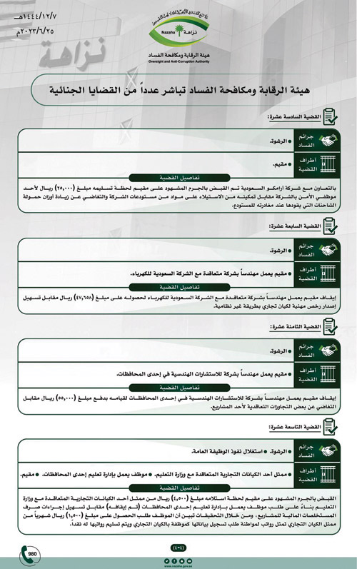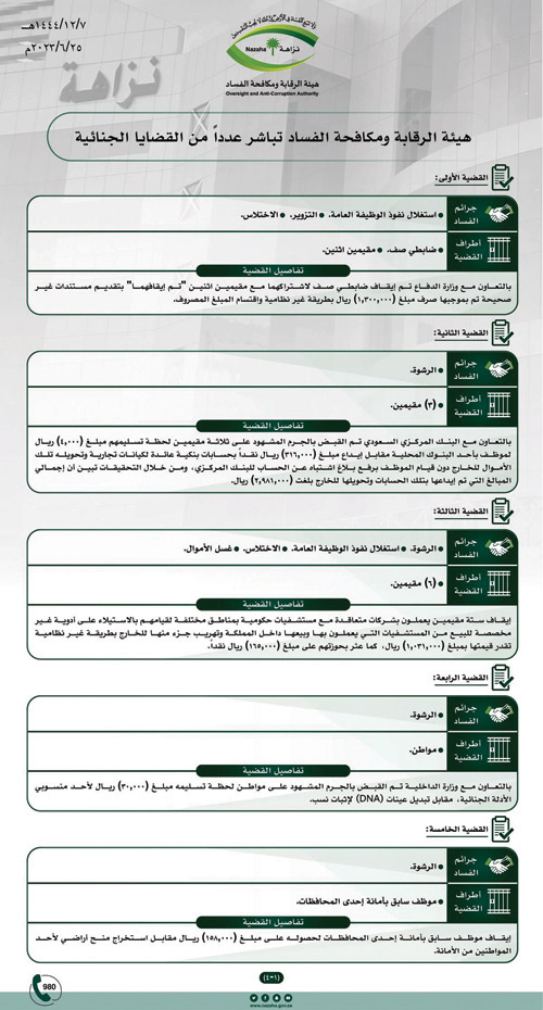 صرَّح المتحدث الرسمي في هيئة الرقابة ومكافحة الفساد بأن الهيئة باشرت عددًا من القضايا الجنائية خلال الفترة الماضية، وجار استكمال الإجراءات النظامية بحق مرتكبيها، وكان أبرز القضايا على النحو الآتي: