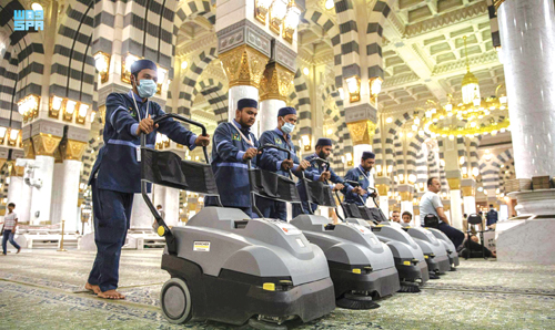 ولضمان سير العمل تحرص الإدارة على تكثيف أعمال الكنس والتعقيم والتعطير للسجاد قبل وبعد كل صلاة, وذلك للارتقاء بالخدمات المبذولة في المسجد النبوي الشريف وخدمة حجاج بيت الله على أكمل وجه.