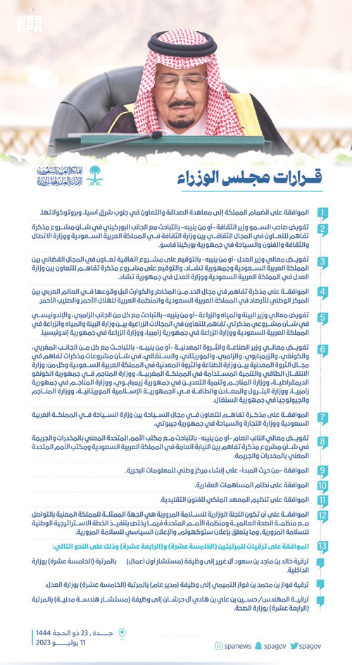 واطّلع المجلس، على الموضوعات المدرجة على جدول أعماله، من بينها موضوعات اشترك مجلس الشورى في دراستها، كما اطّلع على ما انتهى إليه كلٌّ من مجلس الشؤون الاقتصادية والتنمية، ومجلس الشؤون السياسية والأمنية، واللجنة العامة لمجلس الوزراء، وهيئة الخبراء بمجلس الوزراء في شأنها. وقد انتهى المجلس إلى ما يلي: أولاً: الموافقة على انضمام المملكة إلى معاهدة الصداقة والتعاون في جنوب شرق آسيا، وبروتوكولاتها.