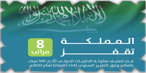 رفعت المملكة تصنيفها الدولي في القدرة الإنتاجية السنوية لمناولة الحاويات في موانئها البحرية، حيث قفزت من المرتبة 24 إلى المرتبة 16 دولياً في مناولة أعداد الحاويات، وذلك وفق التقرير السنوي «Lloyd)s List» لأكبر 100 ميناء بالعالم الصادر حديثاً للعام الجاري ...