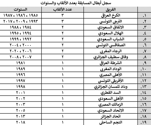 يحمل الكرخ العراقي مع الترجي التونسي السيادة في تحقيق الألقاب بتحقيق كل منهما 3 ألقاب، فيما استطاع 19 نادياً تحقيق لقب البطولة يمثلون 7 دول، وتأتي أندية السعودية الأكثر بواقع خمسة أندية هي الاتفاق والهلال والشباب والأهلي والاتحاد.