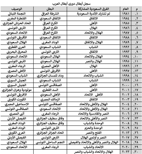 وشارك 11 نادياً سعودياً في البطولة العربية والتي تعتبر من أكثر الأندية العربية مشاركة بجانب الأندية المغربية والجزائرية، واستطاعت أنديتنا السعودية تحقيق 8 ألقاب كأكثر الدول العربية تحقيقاً للقب.