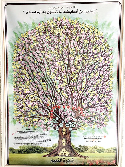 ولأنه مفكر وعملي أنشأ لوحة بأسماء أفراد العائلة وخطط لها ورسمها لتكون أشبه بشجرة تعلق في بيوت العائلة، هي من نسجه وعمله وأنفق عليها من دخله (عمل مجيد ومقدر).