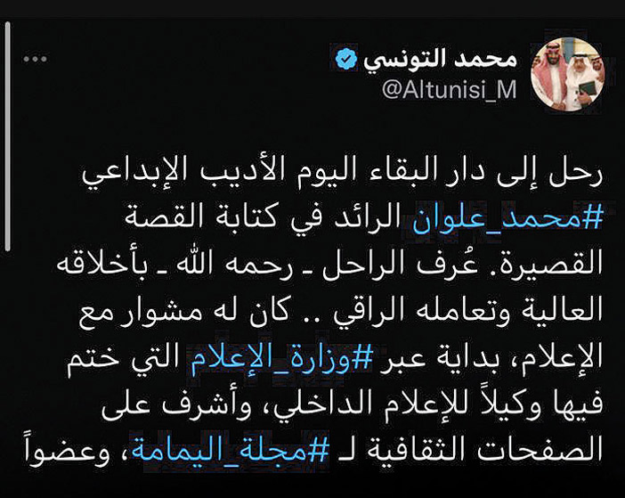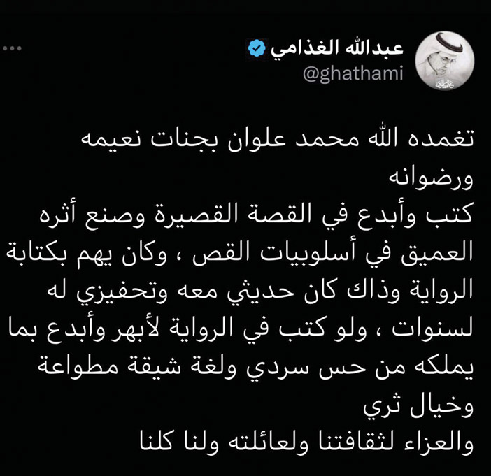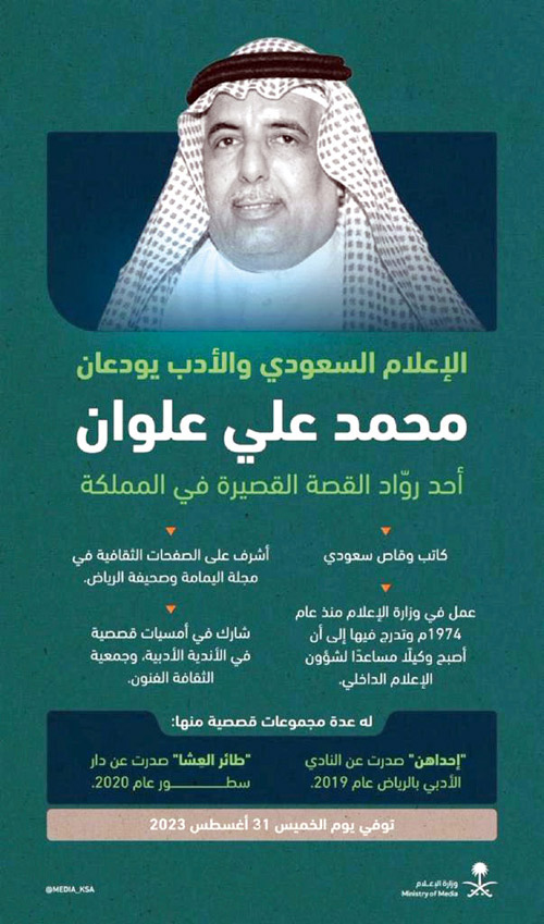 انتقل إلى رحمة الله تعالى صباح أمس الخميس الأديب السعودي محمد علي علوان -يرحمه الله- الوكيل لشؤون الإعلام الداخلي في وزارة الإعلام -الأسبق- الذي عمل فيها منذ 1974م /1394هـ ،استطاع في عمله أن يوازي بين الرقابة الرسمية وحسّه الإبداعي ويزاوج بينهما في توليفة إبداعية ، وهو أحد أساطين كتابة القصة القصيرة في المملكة، وقد أثرى المشهد الثقافي السعودي بعدد من الأعمال الإبداعية. وأشرف على الصفحات الثقافية في مجلة اليمامة، وكذلك ملحق جريدة الرياض الثقافي وأديب له مجموعات قصصية خصّصت دورية «الراوي» الصادرة عن نادي جدة الأدبي ملفاً ودراسات نقدية عن مجموعاته القصصيّة.